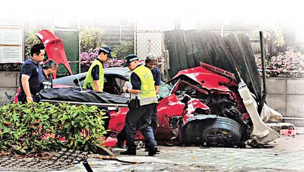 马驰驾驶的法拉利车头严重变形,他夹在残骸中,救援人员要锯开车身才救出他。