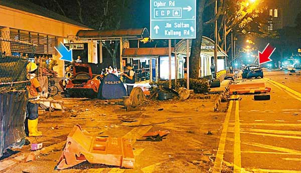 中国富豪马驰驾驶的法拉利(蓝箭嘴),拦腰撞向的士(红箭嘴)後铲向武吉士地铁站外行人路,的士撞飞至几米远,汽车零件散落一地。