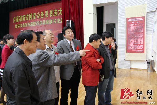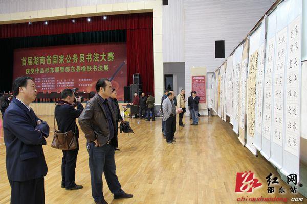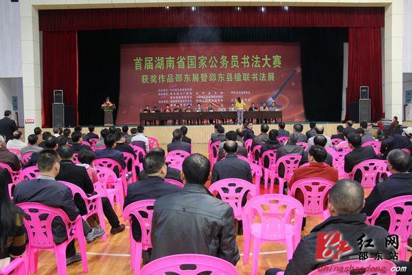 4月20至21日,湖南省首届国家公务员书法大赛获奖作品巡展暨邵东县楹联书法展在邵东县体育馆举行。湖南省文史研究馆巡视员阳盛海、中国楹联协会副秘书长肖良平、湖南省文化厅社文处副处长倪文华、湖南省公务员书法委员会主任佘辉、邵阳市人大常委会副主任李斌、邵阳市文联副主席曾伟子、邵阳市楹联协会常务副会长、秘书长谢道溪、邵阳市美协副主席佘焕晟及邵东县领导黎仁寅、沈志定、刘细云、傅丽华、肖新华等出席了活动启动仪式。