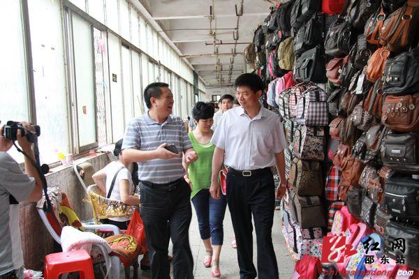 邵阳市政协副主席肖益林(左一)在邵东县政协主席申桂荣(右一)的陪同下到邵东县工业品市场调研