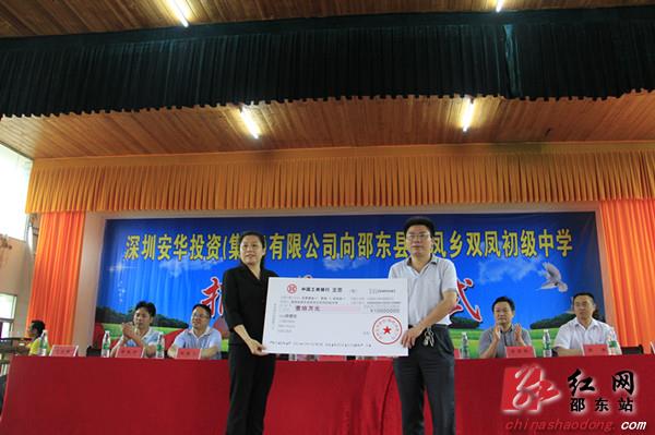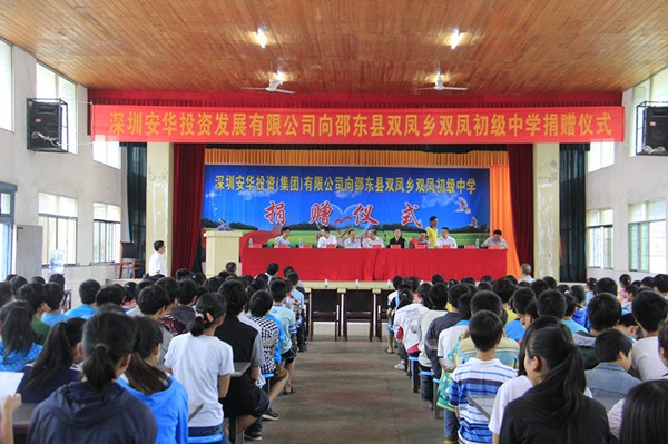 6月9日,深圳安华投资(集团)有限责任(简称安华公司)公司向双凤中学捐赠了价值10万元的电脑等教学设备。市人大常委会副主任李斌、市教育局局长肖玉叶、县委副书记王定松、县人大常委会副主任李本功现场见证了这一善举。