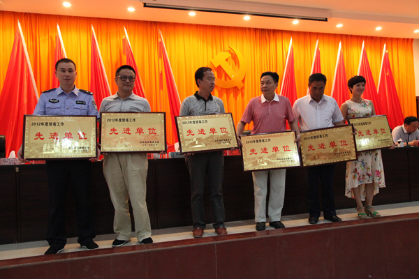 邵东县人大常委会副主任李本功宣读邵东县2012年度乡镇、街道禁毒工作考核排名通报和2012年度禁毒工作先进单位和先进个人表彰决定。县政协副主席尹安中宣布约谈单位名单。