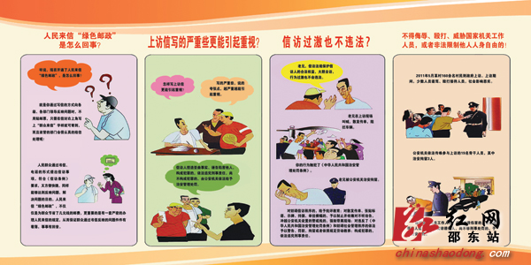 从5月4日开始,该县在开展党的群众路线教育实践活动中结合本职工作,通过采取法规知识宣讲、张贴宣传标语、散发宣传材料、摆放宣传展板、回答群众咨询并创造性地使用“卡通画”模式,把《信访条例》及国家信访局《关于进一步规范信访事项受理办理程序引导来访人依法逐级走访的办法》和省公安厅规范违法上访行为通知规定,用人们生活中最朴实的语言对话形式生动、形象、直观地表现出来,在全县28个乡镇(场、办)轮回展出。达到了信访群众一看就懂,一见就会的效果。此举得到了广大群众的认同和称赞。很多上访人对我们信访干部说:“你们这个图画就是好,看信访知识就像看连环画一样简单,不是这些画报,我们天天在农村哪个晓得怎样信访嘛!反正只要有了冤屈就摸不着门的急着瞎闹瞎跑,现在我们也晓得和嘎信访了”。