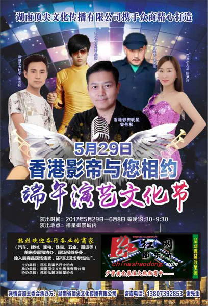 5月22日,邵东县演艺行业协会举办新闻发布会,由湖南顶尖文化传播有限公司承办的端午演艺文化节将在邵东县城福星御景城举行,活动时间为5月29日至6月8日,香港影星曾伟权将莅临演艺文化节现场表演,并与观众一起进行包粽子比赛。