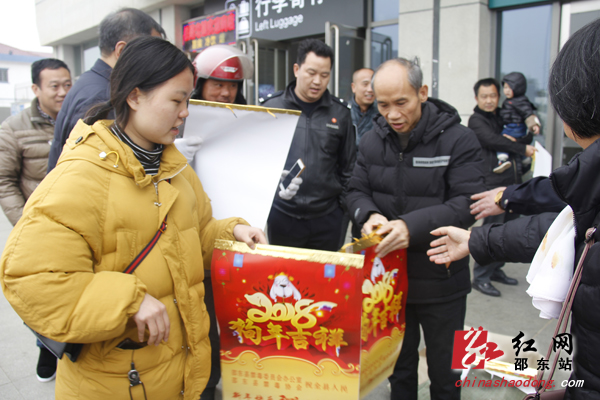邵东县禁毒委副主任、禁毒协会会长郑长清在高铁站向回乡群众发放禁毒宣传挂历