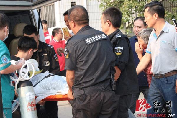 空中救援队与保安一起将病人抬下120急救车