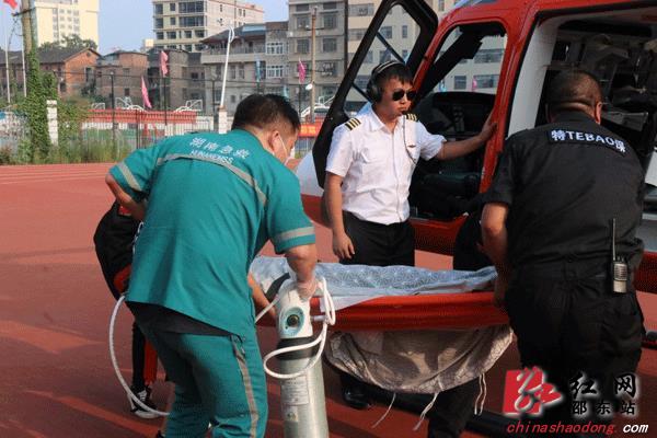 16时53分,宁先生从ICU病房送至120急救车上;17时3分,医护人员护送停在邵东一中振华实验学校足球场的直升机上;4分钟后,直升飞机升空,1小时后平安转至省脑科医院。