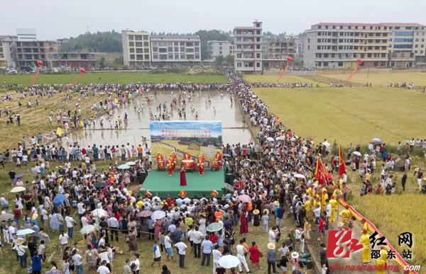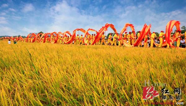 9月16日下午,邵东县两市塘街道办坝上新村田埂上热闹非凡,108节长龙在金色的稻田间舞动,脚踩式打谷机打禾让人回味儿时收获季节的乐趣,千余名群众在田中抓鱼,享受丰收带来的喜悦。这是该县庆祝首个农民丰收节系列活动之一。随后,还将在仙槎桥镇青山村、堡面前乡大羊村举办庆祝活动。