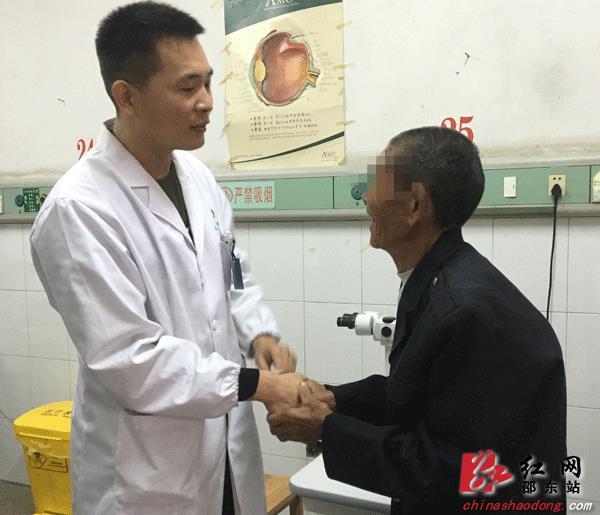 患者仇某庆是一名抗美援朝的战士,仙槎桥镇人,老人曾在朝鲜征战三年。约五六年前,他眼睛看东西开始有点模模糊糊,像蒙了一层纱,老人曾去别的地方咨询过,但由于年事已高,手术风险大,老人也就拖着一直没去治疗。今年9月21日,邵东县中医医院去仙槎桥镇为老百姓进行免费白内障筛查,王兵给老人检查后确诊为白内障,当即预约了手术时间。"如今政府这么好,手术免费,昨天做的手术,今天就能看到东西了!”仇某庆激动地说。